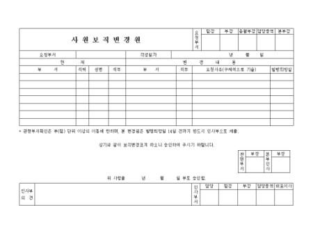 현재 부서,직위,직무와 변경 부서,직무,변경사유를 기록하는 양식입니다.