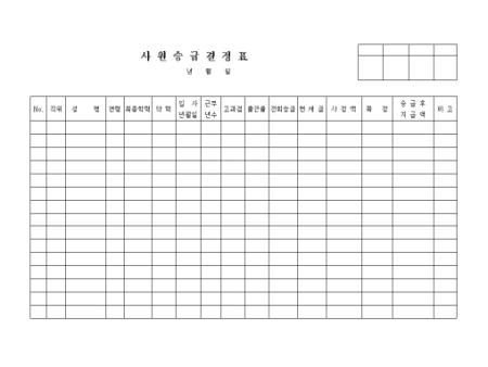 사원인적사항,입사년월일,근무년수,고과점,출근율,전회승급,현재급,사정액,확정으로 구성된 사원승급결정표입니다.