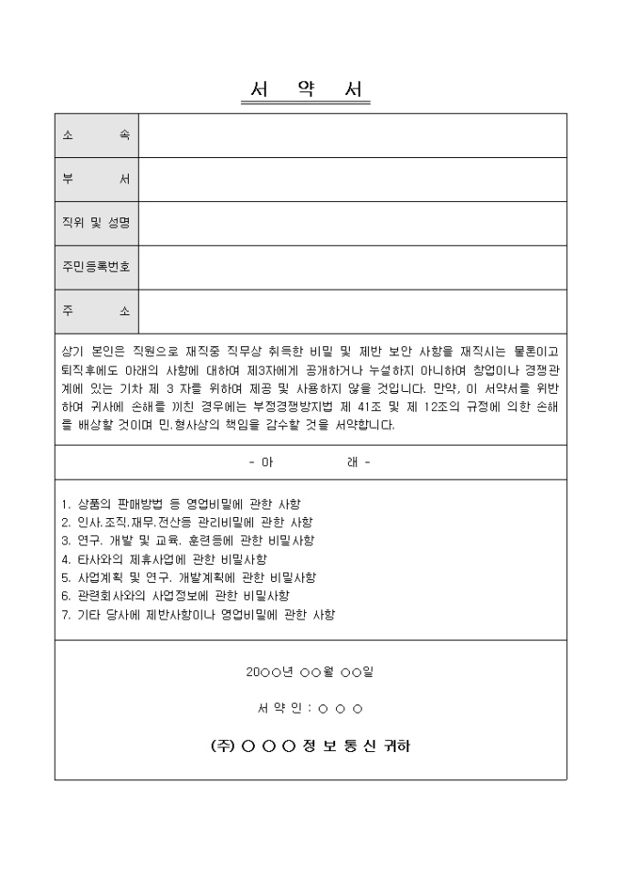 9,000원/월퇴직후 재중중 직무상 취득한 비밀 및 제반 보안사항을 공개하거나 누설하지 않겠다는 내용의 서약서입니다.