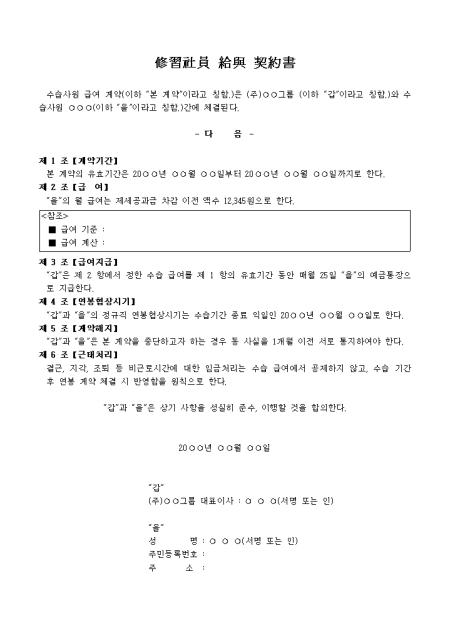 회사와 수습사원간에 급여, 근로기간등의 사항을 성실히 준수, 이행할것을 체결하는 급여계약서입니다. 제 1 조【계약기간】