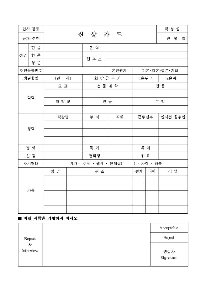 9,000원/월인적사항,학력,경력,병영,가족사항을 기록하는 신상카드입니다.