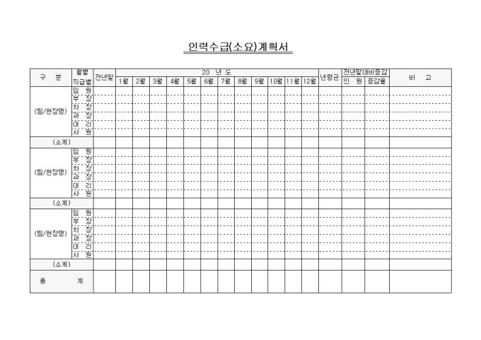 9,000원/월전년도와 비교하여 인력수급계획를 할 수 있는 양식입니다.