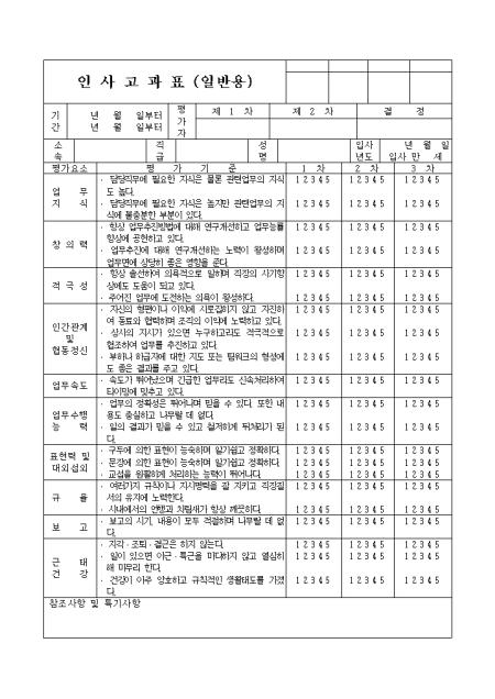일반적으로 사용할 수 있는 인사고과표로 평가요소로는 아래와 같습니다. 1.업무지식 2.창의력 3.적극성 4.인간관계 및 협동정신 5.업무속도 6.업무수행능력 7.표현력 및 대외섭외 8.규율 9.보고 10.근태,건강