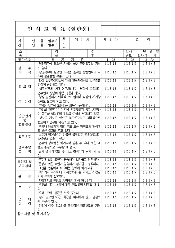 9,000원/월일반적으로 사용할 수 있는 인사고과표로 평가요소로는 아래와 같습니다. 1.업무지식 2.창의력 3.적극성 4.인간관계 및 협동정신 5.업무속도 6.업무수행능력 7.표현력 및 대외섭외 8.규율 9.보고 10.근태,건강