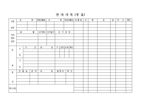 신원보증,자격면허검정 내용,교육기록,포상내역을 기록하는 인사기록부입니다.