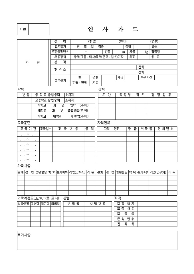 9,000원/월인적사항,학력,교육훈련,가족사항,외국어정도를 기록하고 사진을 부착하는 인사카드입니다.