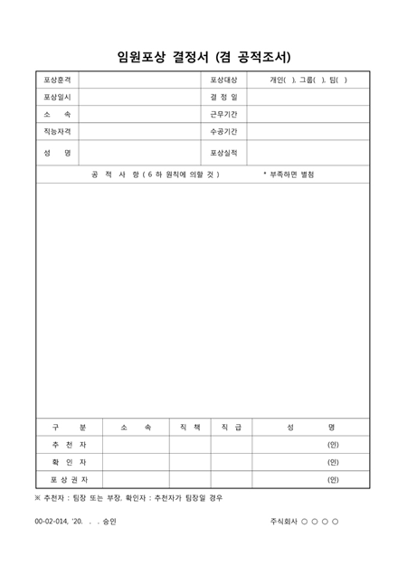 포상훈력,포상일시,소속,직능자격,근무기간,수공기간,포상실적,공적사항을 기록하는 양식입니다.
