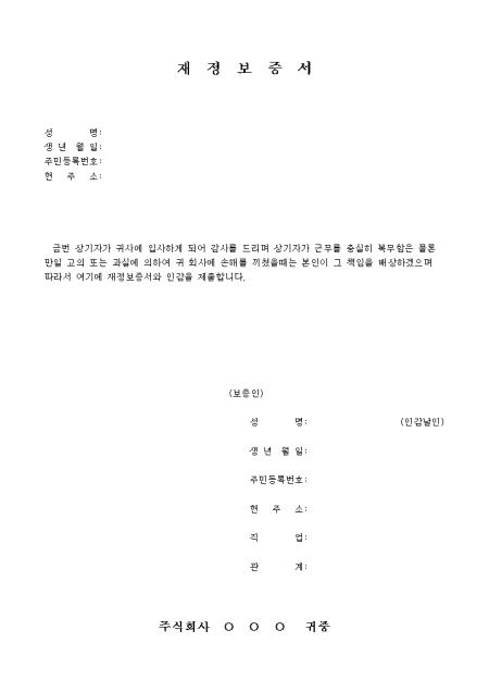 입사시 제출하는 재정보증서입니다.