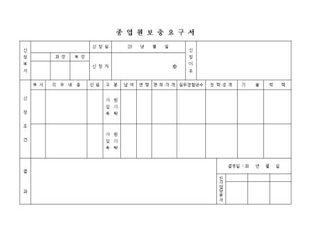 신청부서,신청조건,결과란으로 구성된 종업원보충요구서입니다.