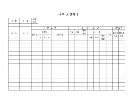 직무,과업,숙련요건,습득요건,경력요건으로 구성된 직무요건서 양식입니다.