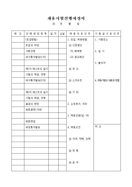 진행관리항목,일자,요일,채용의포인트,시험실시포인트로 구성된 채용시험진행예정서입니다.