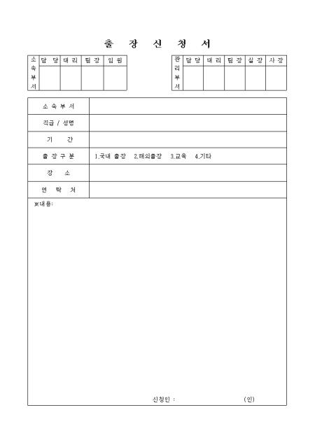 소속부서,직급,성명,기간,출장구분,장소,연락처,내용을 기록하는 출장신청서입니다.
