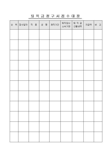 순위,접수일,직종,성명,재직기간,퇴직당시소속기관,퇴직금산출내역,지급액을 기록하는 퇴직금청구서접수대장입니다.