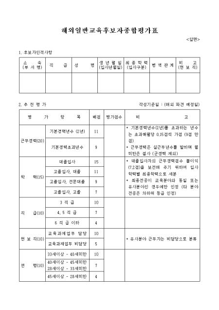 후보자인적사항,추천평가를 기록하는 해외일반 교육후보자 종합평가표입니다.
