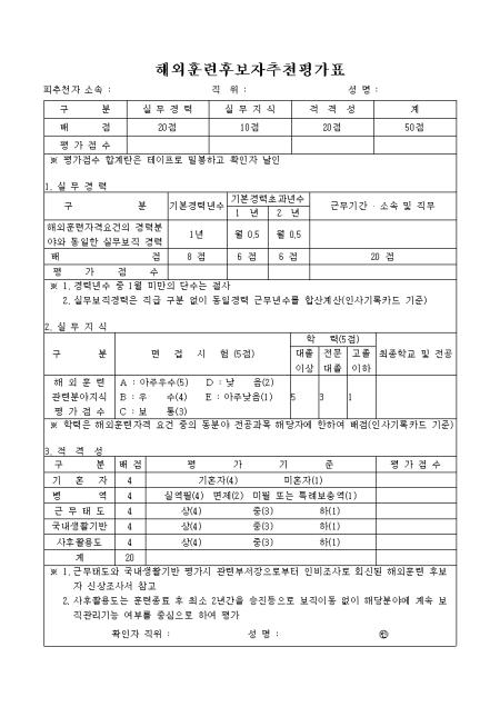 실무경력,실무지식,적격성을 평가하는 해외훈련 후보자 추천평가표입니다.
