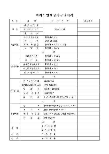 구분,내역,계산근거,예상자금을 기록하는 외자도입예상자금명세서입니다.