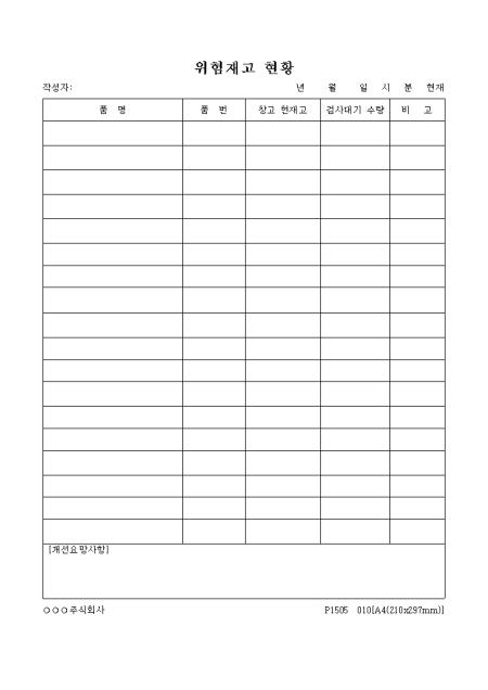 품명,품번,창고 현재고,검사대기 수량,비고란으로 구성된 위험재고 현황표입니다.