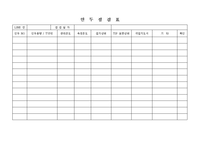 9,000원/월인두번호,인두용량,관리온도,측정온도,접지상태,TIP표면상태,작업지도서를 기록하는 인두점검표입니다.
