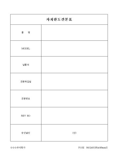 품명,모델,납품처,견본채집일,견본번호,승인날인을 기록하는 자재한도견본표입니다.