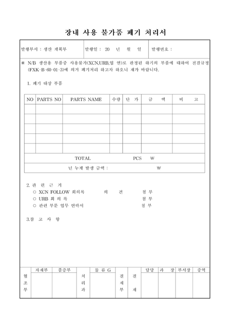 폐기대상부품매역,관련근거를 기록하는 장내사용 불가가품 폐기처리서입니다.
