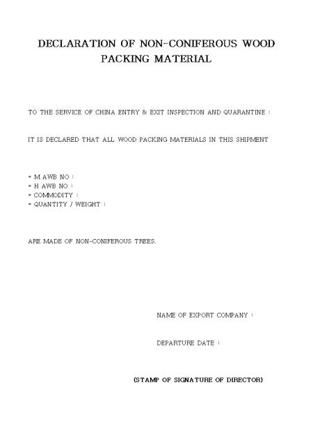 \DECLARATION OF NON-CONIFEROUS WOOD PACKING MATERIAL양식입니다.