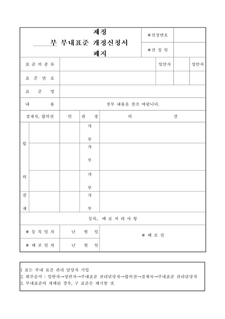 표준의 종류,표준번호,표준명,내용,합의란,결재란이 있는 양식입니다.