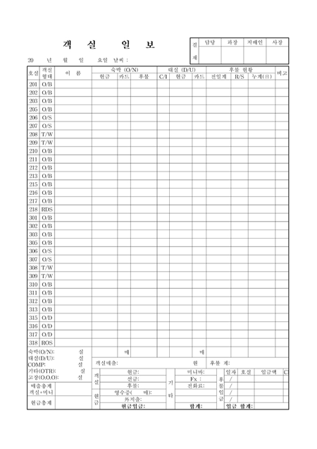 호실,객실형태,이름,숙박결재방법,대실결제방법,후불현황을 기록하는 객실일보입니다.