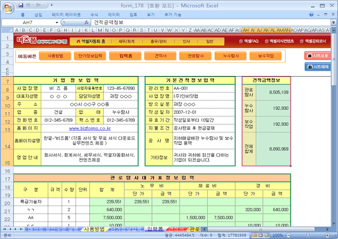 9,000원/월누수탐사 건설업에 종사하고 있는 사업장에서 사용하는 서식으로서 관로탐사, 누수탐사, 보수작업등의 세부 대가표와 대가표를 총체적으로 나타낼 수 있는 견적서가 포함되어 있는 자동화 서식입니다. 입력폼에서 해당자료를 입력하면 각 서식에 자동으로 입력되어 견적액을 자동으로 계산해는 주는 자동화 서식입니다.