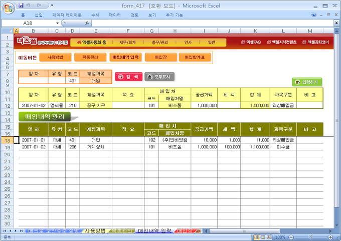 기존에 비즈폼에서 다운받았던 매입매출장도 정말 잘 쓰고 있었는데 막상 저희는 세금계산서를 국세청에서 직접발행해서 그런지 매입매출장도 좀 간단히 작성하고 싶고, ...