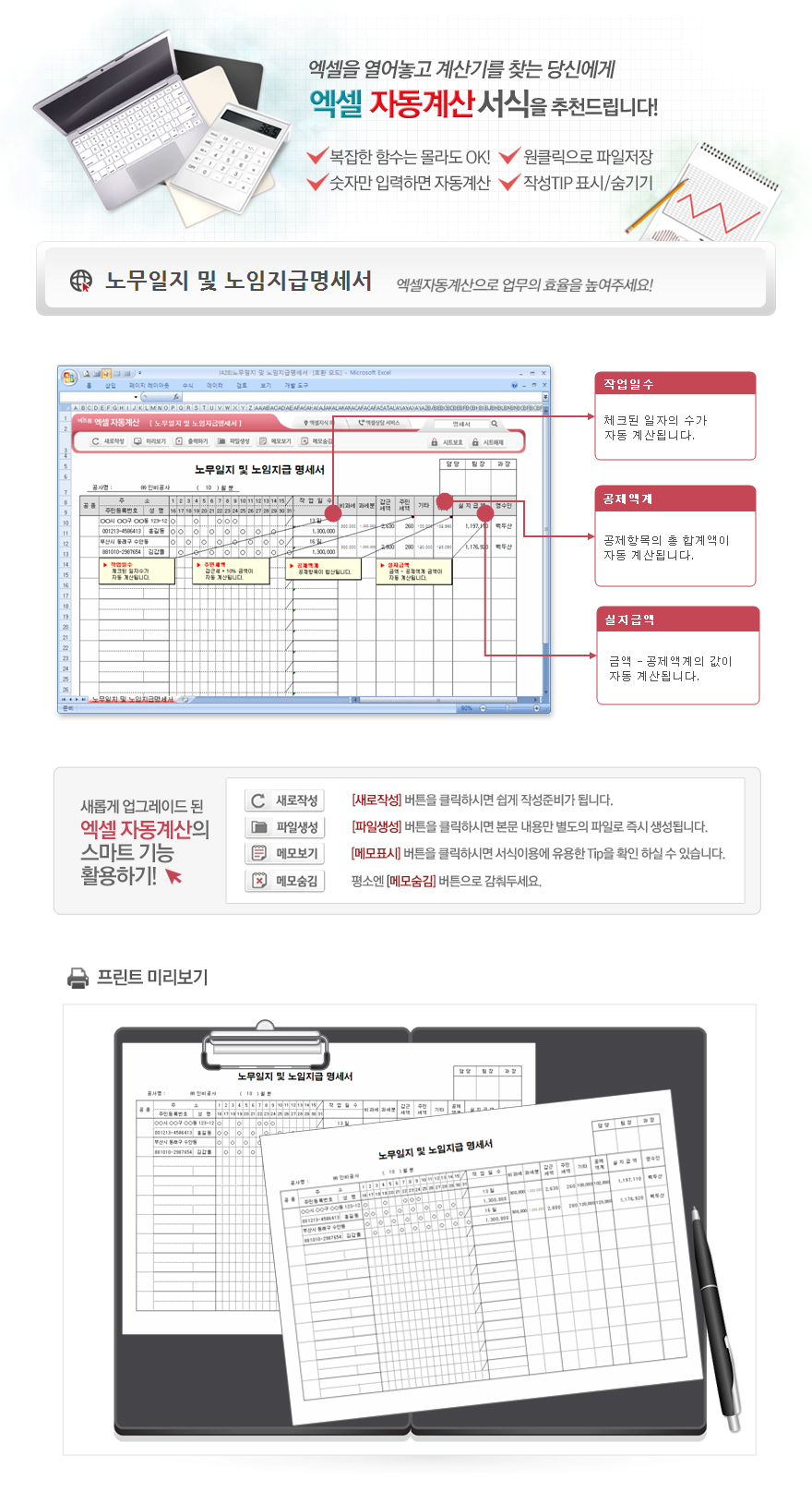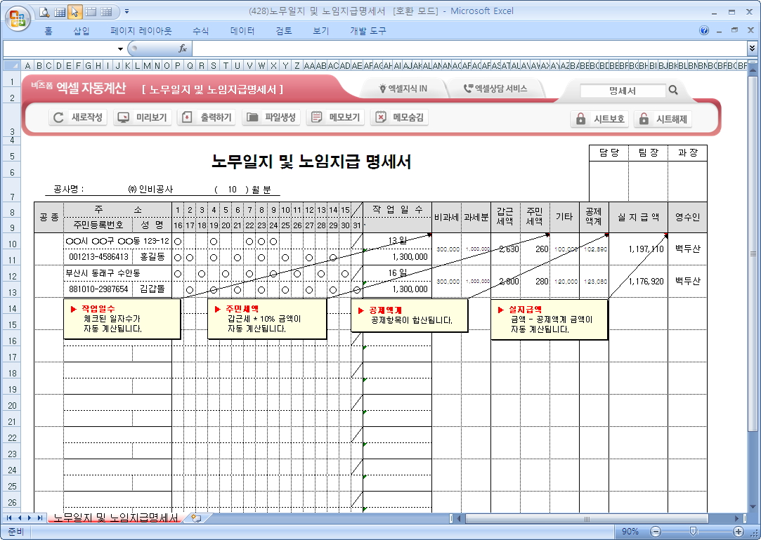 9,000원/월작업일수 및 주민세, 공제액 등을 계산하여 실지급액을 손쉽게 계산할 수 있는 자동계산 서식입니다.