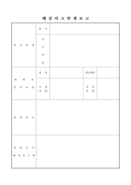 사고발생내용,피해자인적사항,피해정도,피해자측 배상요구액을 기록하는 배상사고발생보고서입니다.