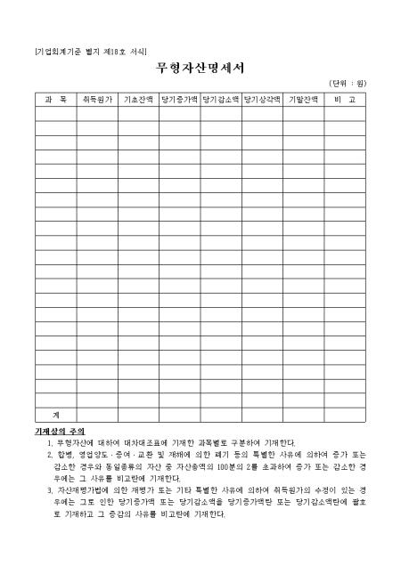 무형자산에 대해 과목별 취득원가, 기초잔액, 당기증가액, 당기감소액,당기상가액들을 기재하도록 구성된 양식으로 기재상의 주의점도 함께 기록되어 있습니다.