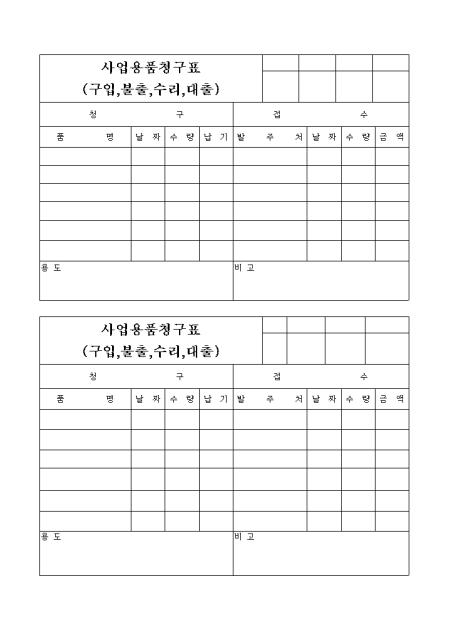 사업용품에 대한 구입,불출, 수리,대출등을 청구할때 사용하는 양식입니다.