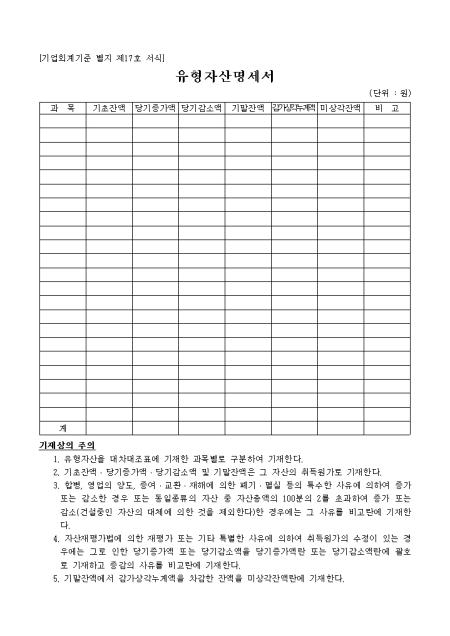 유형자산에 대한 기초잔액, 당기증가액, 당기감소액, 기말잔액들의 항목을 기재하는 명세서 양식입니다.