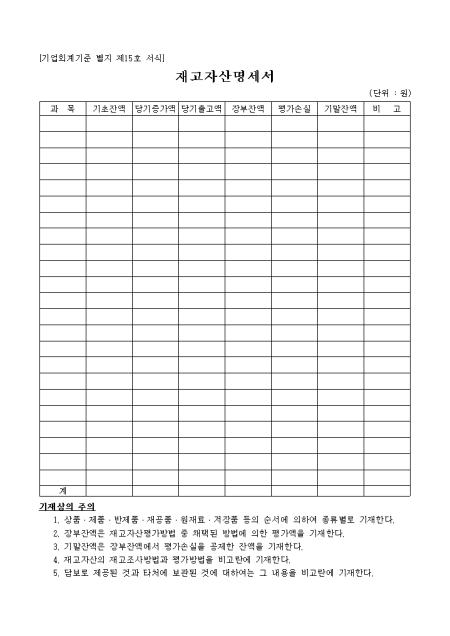 재고자산에 대한 내역을 기재하는 명세서 양식입니다.