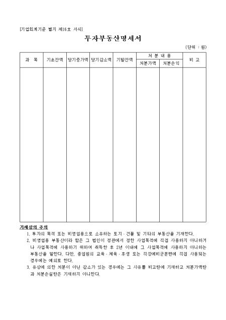 투자 부동산에 대해 기초잔액, 당기증가액, 당기감소액, 처분내용등의 내역별로 기재하는 양식입니다.