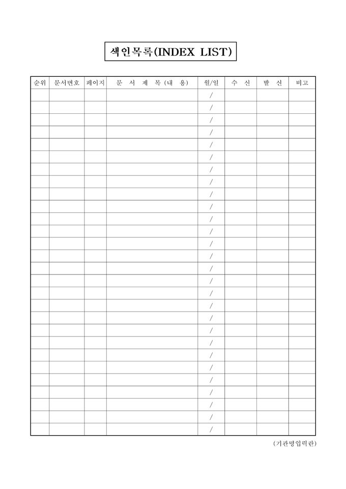 9,000원/월순위,문서번호,페이지,문서제목,수신,발신,비고로 구성된 색인목록표입니다.