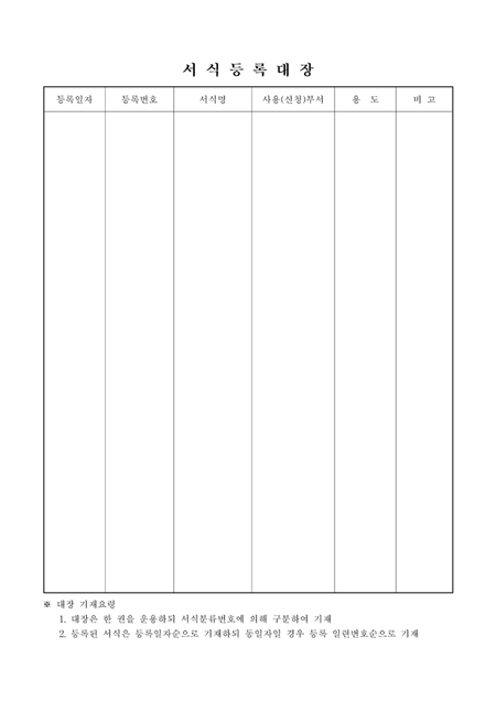 등록일자,등록번호,서식명,사용부서,용도,비고로 구성된 서식등록대장입니다.