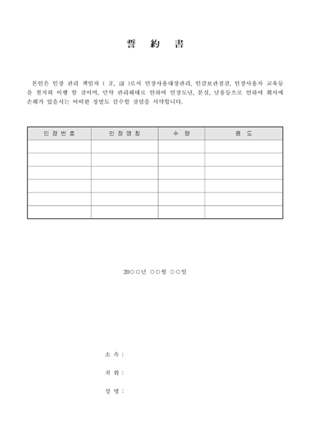인장 관리 책임자 ( 正, 副 )로서 인장사용대장관리, 인감보관점검, 인장사용자 교육등을 철저히 이행 할 것이며, 만약 관리해태로 인하여 인장도난, 분실, 남용등으로 인하여 회사에 손해가 있을시는 어떠한 징벌도 감수할 것임을 서약한다는 내용입니다.
