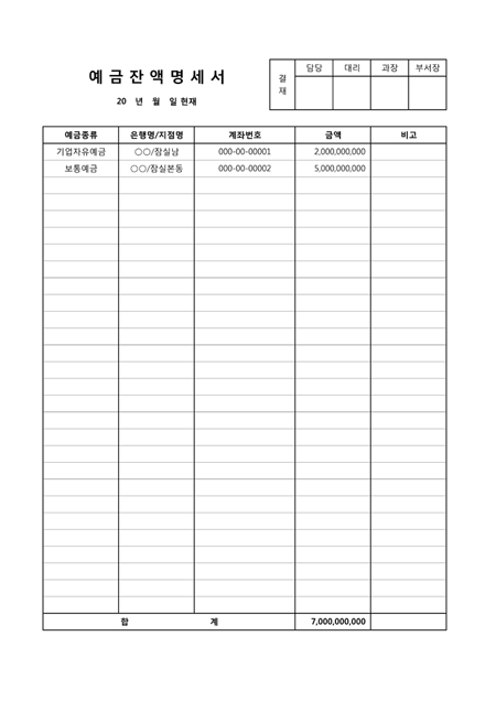 예금종류에 따른 계좌번호와 잔액등을 기록하는 양식입니다.