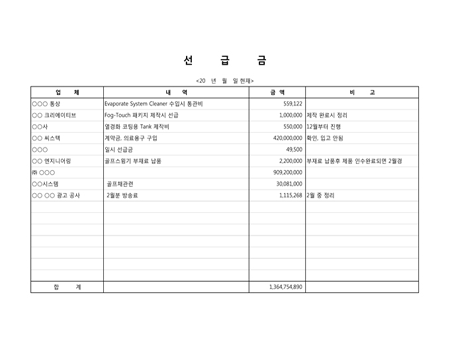 업체별 선급금 내역을 기재하는 양식입니다.