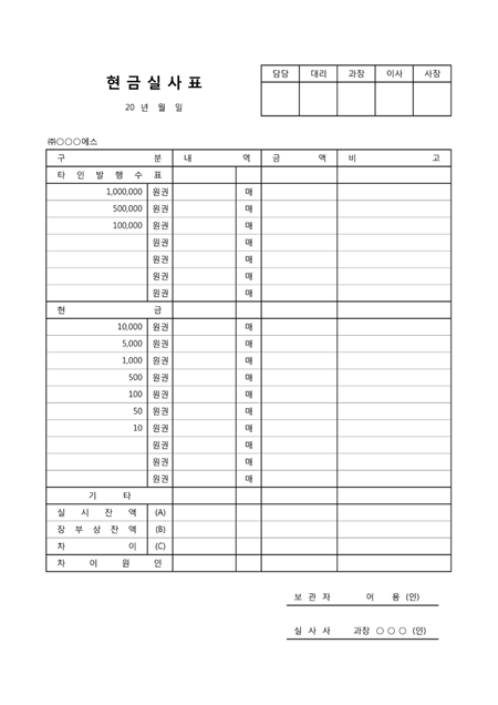 탕행발행수표, 현금등의 내역과 금액을 기재하는 현금실사표 양식입니다.