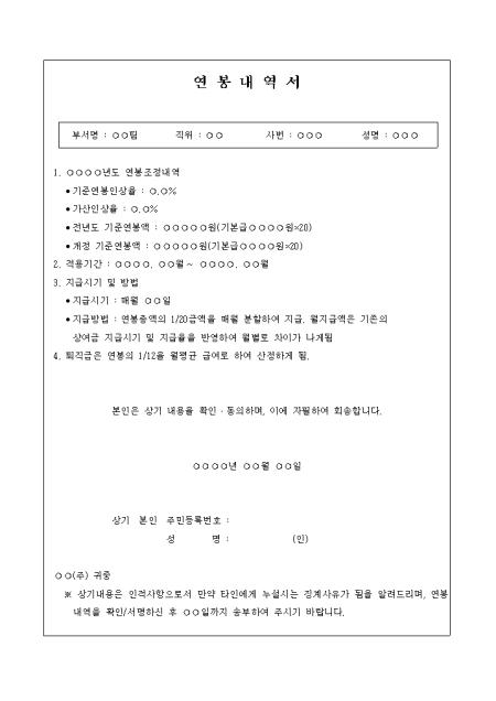 직원의 연봉내역을 기재하는 양식입니다. 구성내용도 들어 있으니 참고하세요.