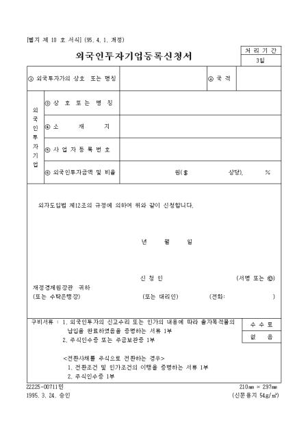 외자도입법 제12조의 규정에 의하여 외국인투자기업등록신청을 할때 사용하는 양식입니다.
