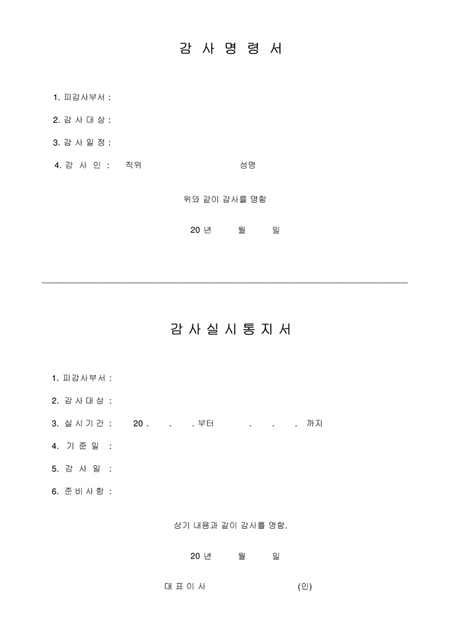감사인과 피감사부서에 대해 감사실시를 명령/통보하는 양식입니다.
