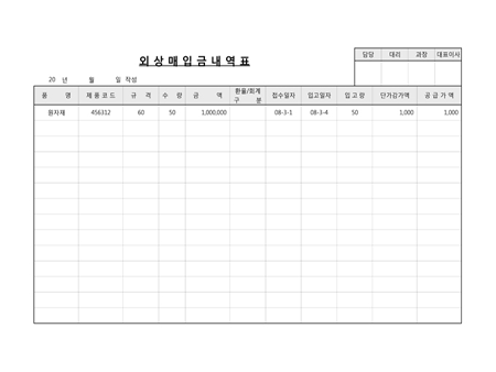품명별로 코드 및 규격, 수량, 금액 등을 기록하여 매입금 내역을 관리하는 양식입니다.