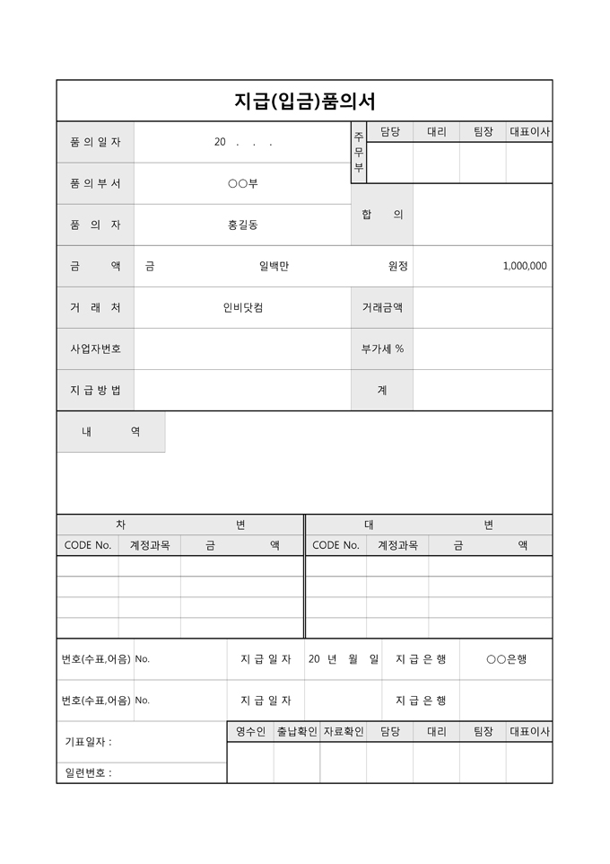 9,000원/월지급/입금 품의에 대해 차변/대변으로 구분하여 세부적인 사항을 입력하는 양식입니다.