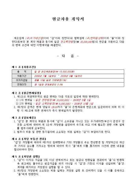 제조업체와 협력업체간에 차용계약을 할때 사용하는 현금차용계약서로써10개의 계약조항으로 구성되어 있습니다. 간단한 샘플을 포함하고 있습니다. 제 1 조【차용조건】