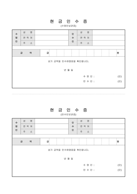 현금 인수에 대한 현금인수증입니다. 수령인과 인수인의 인적사항과 인수금액을 작성하여 인수를 확인할 때 사용할 수 있습니다. 간단한 샘플이 작성되어 있습니다.