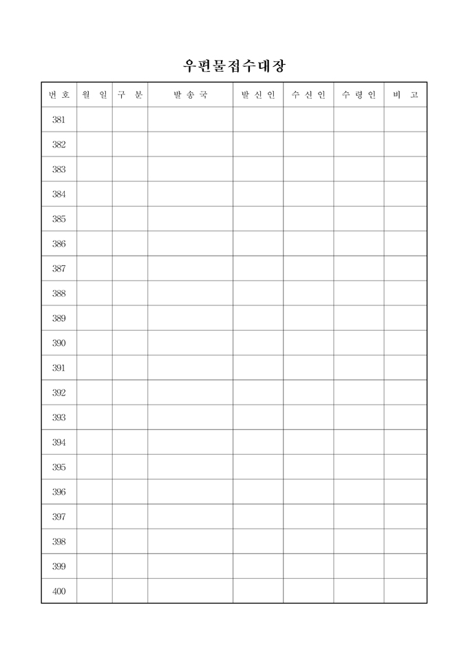 9,000원/월월일,구분,발송국,발신인,수신인,수령인,비고란으로 구성된 우편물접수대장입니다.